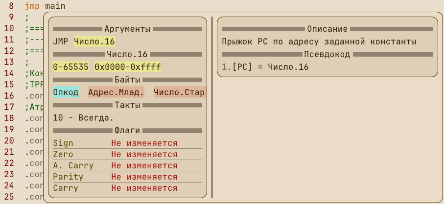 При наведении на выделенную инструкцию открывается всплывающее окно с пояснением и примером работы на псевдокоде.